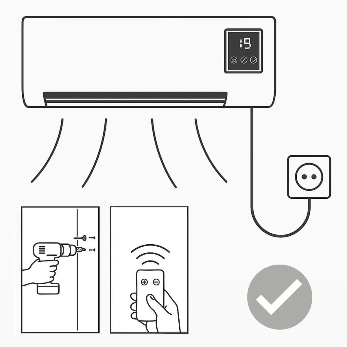 Montavimas itin paprastas. Tiesiog pritvirtinkite kondicionierių prie sienos naudodami komplekte esančius varžtus ir prijunkite jį prie įprasto elektros lizdo.